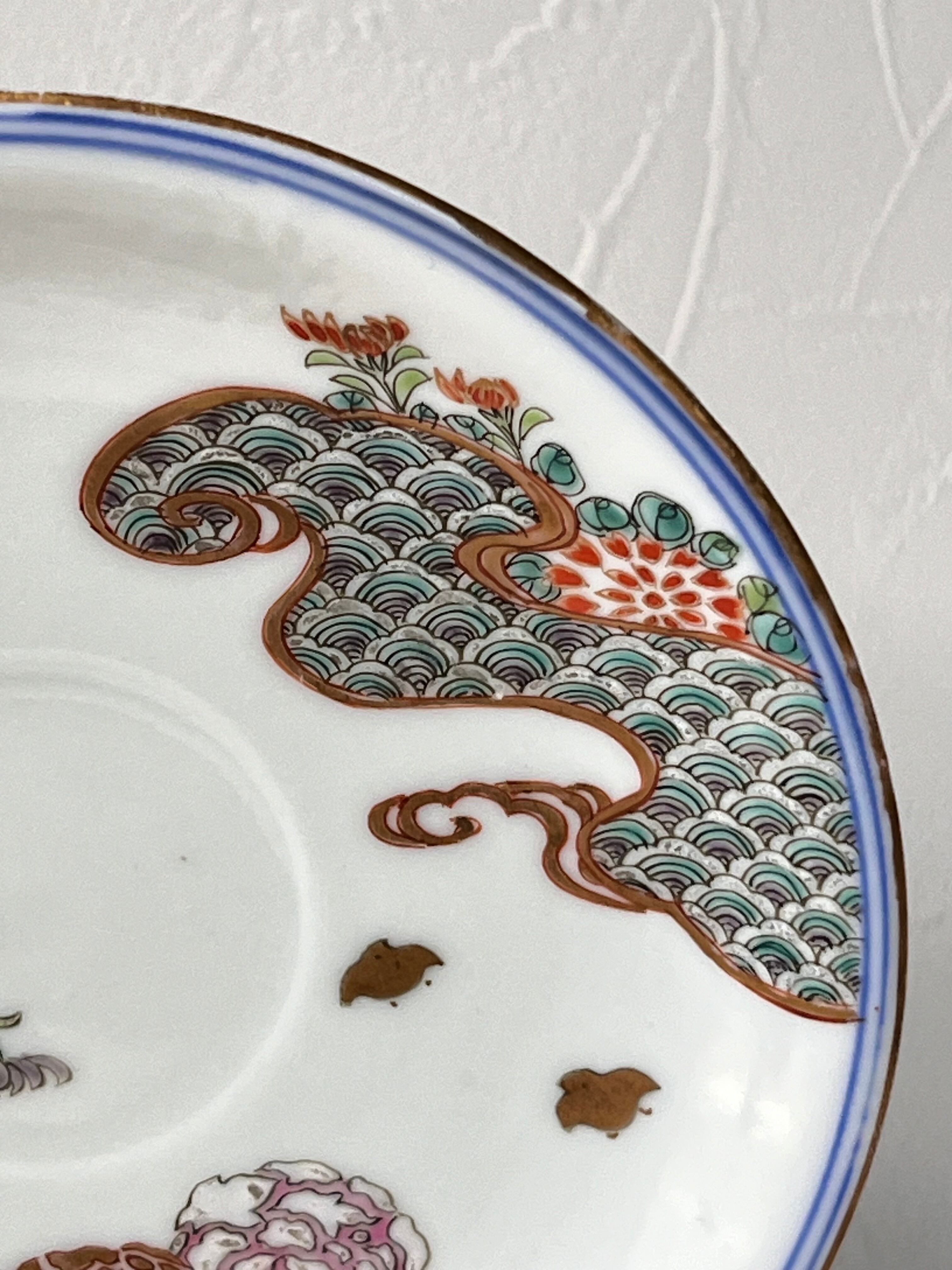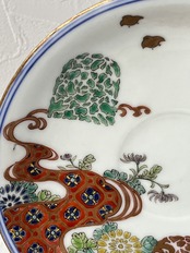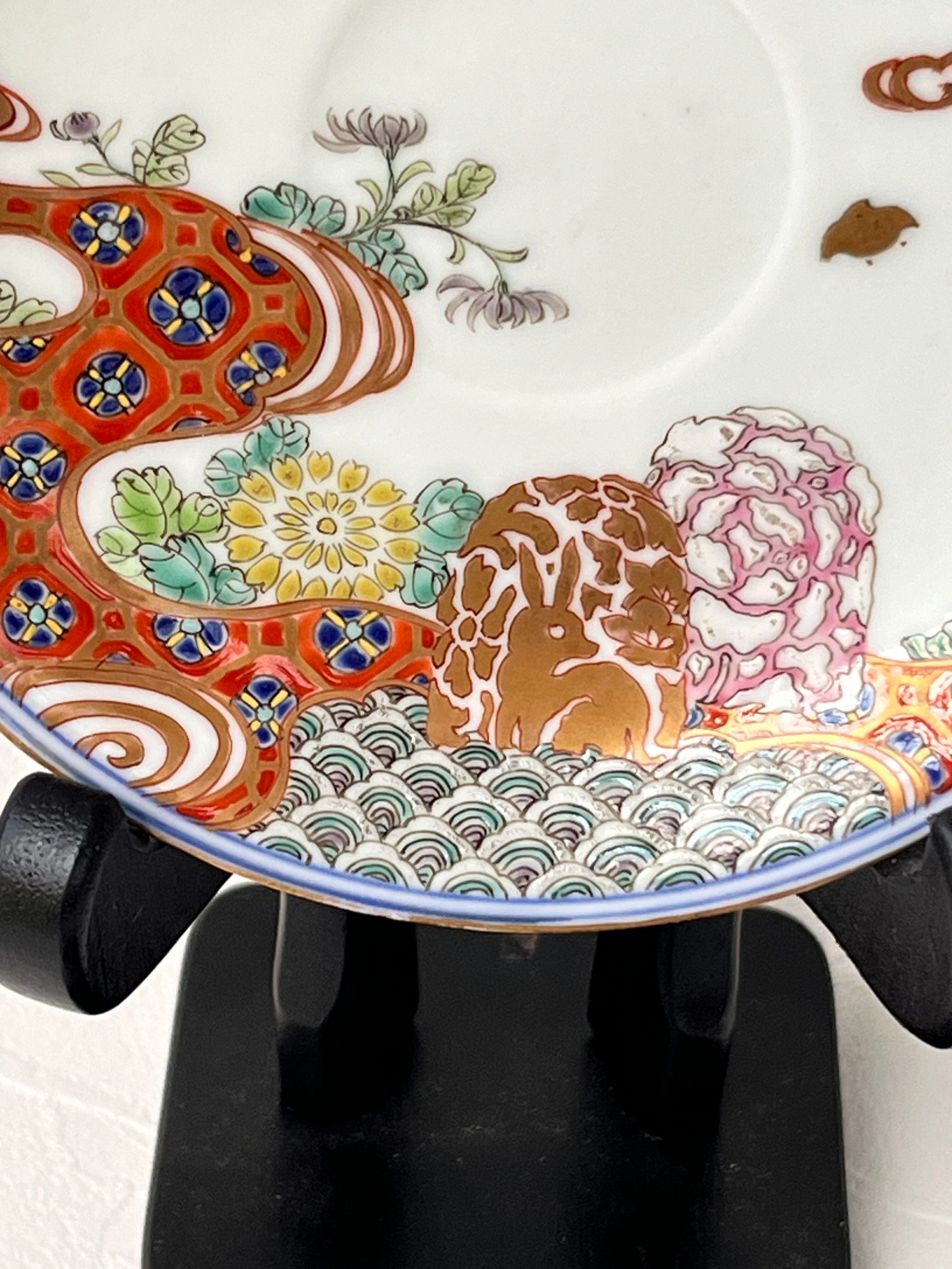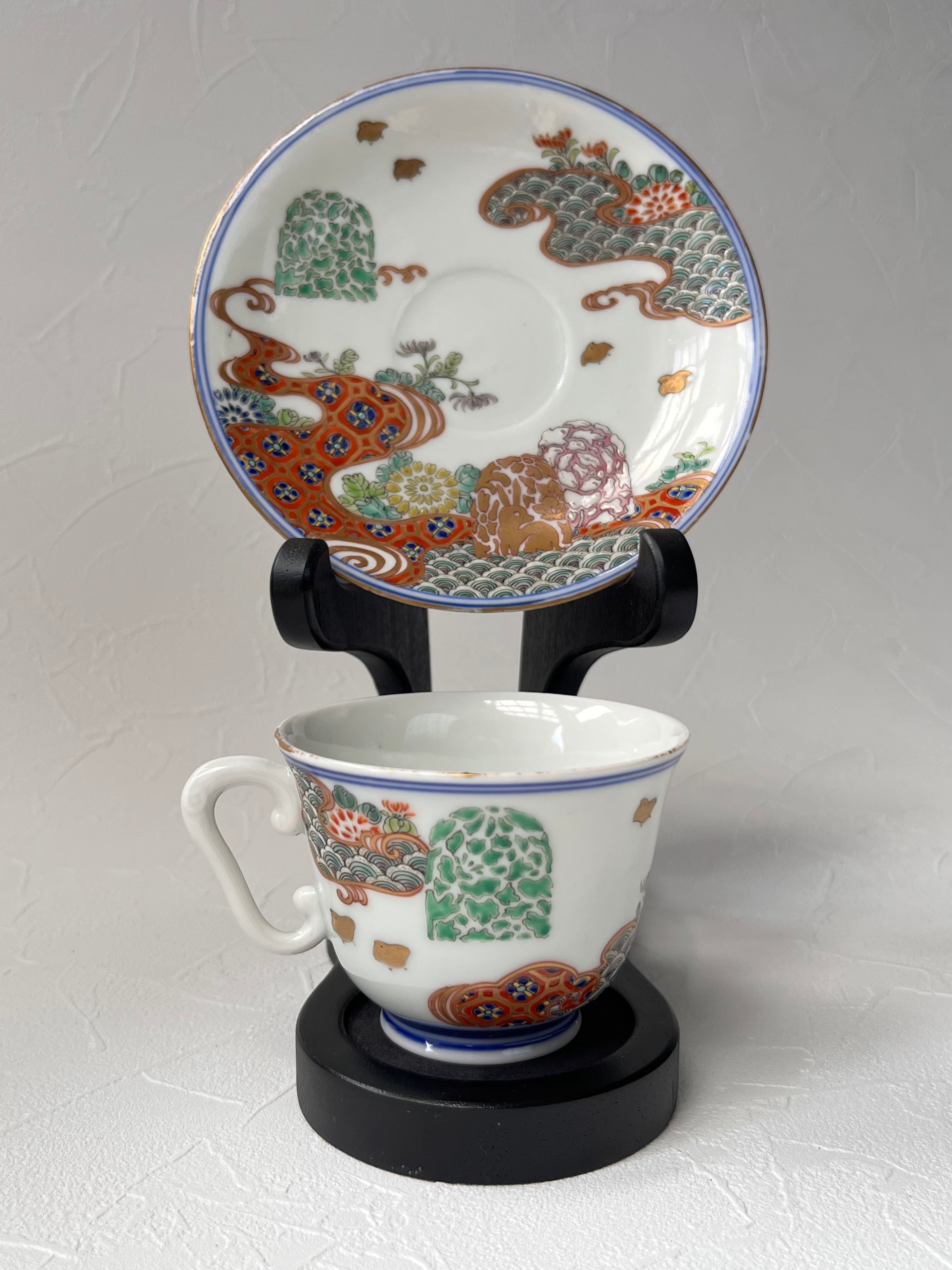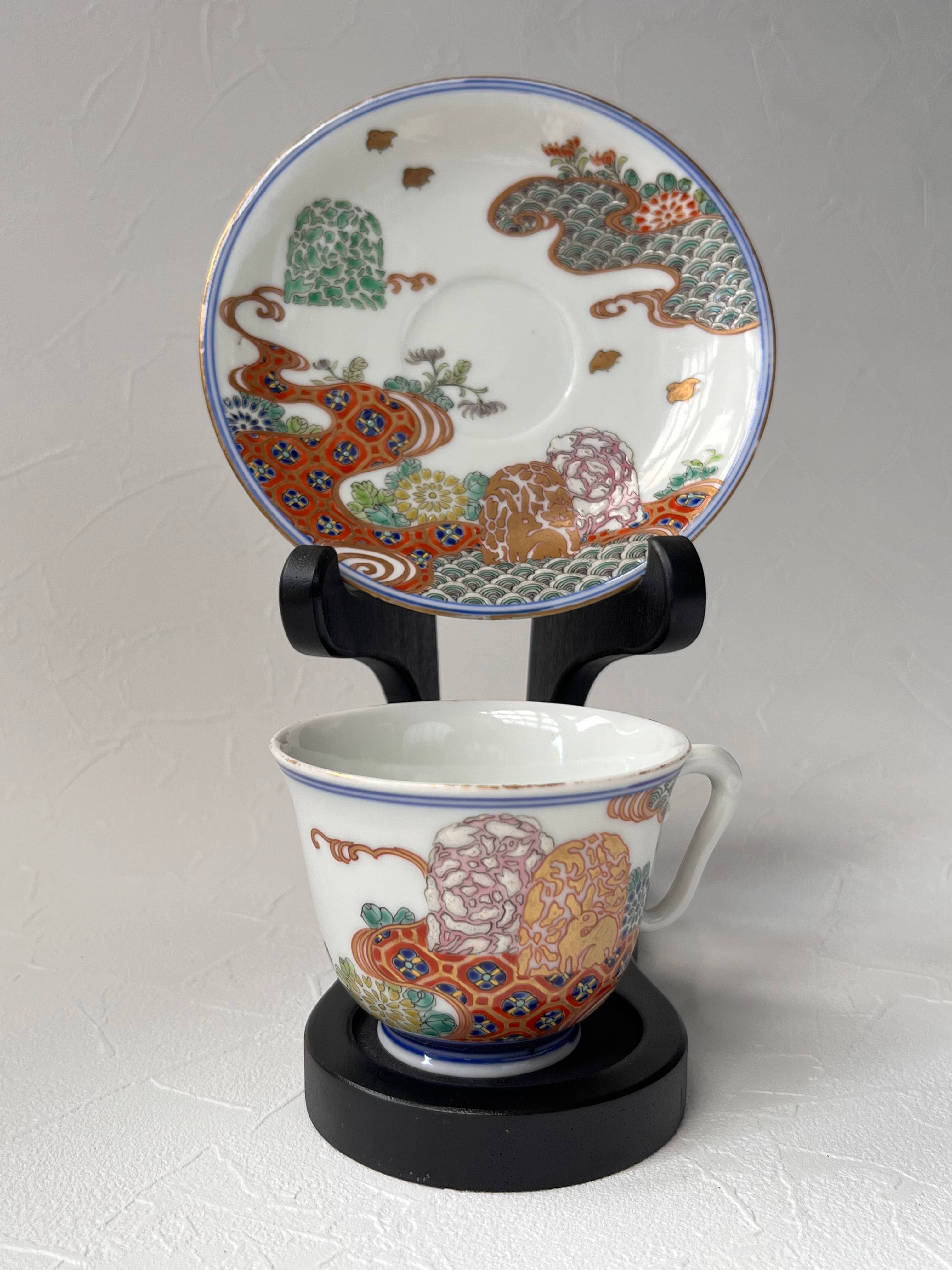 アンティーク 色絵金襴手花兎文カップ&ソーサー 深海墨之助作 明治8年