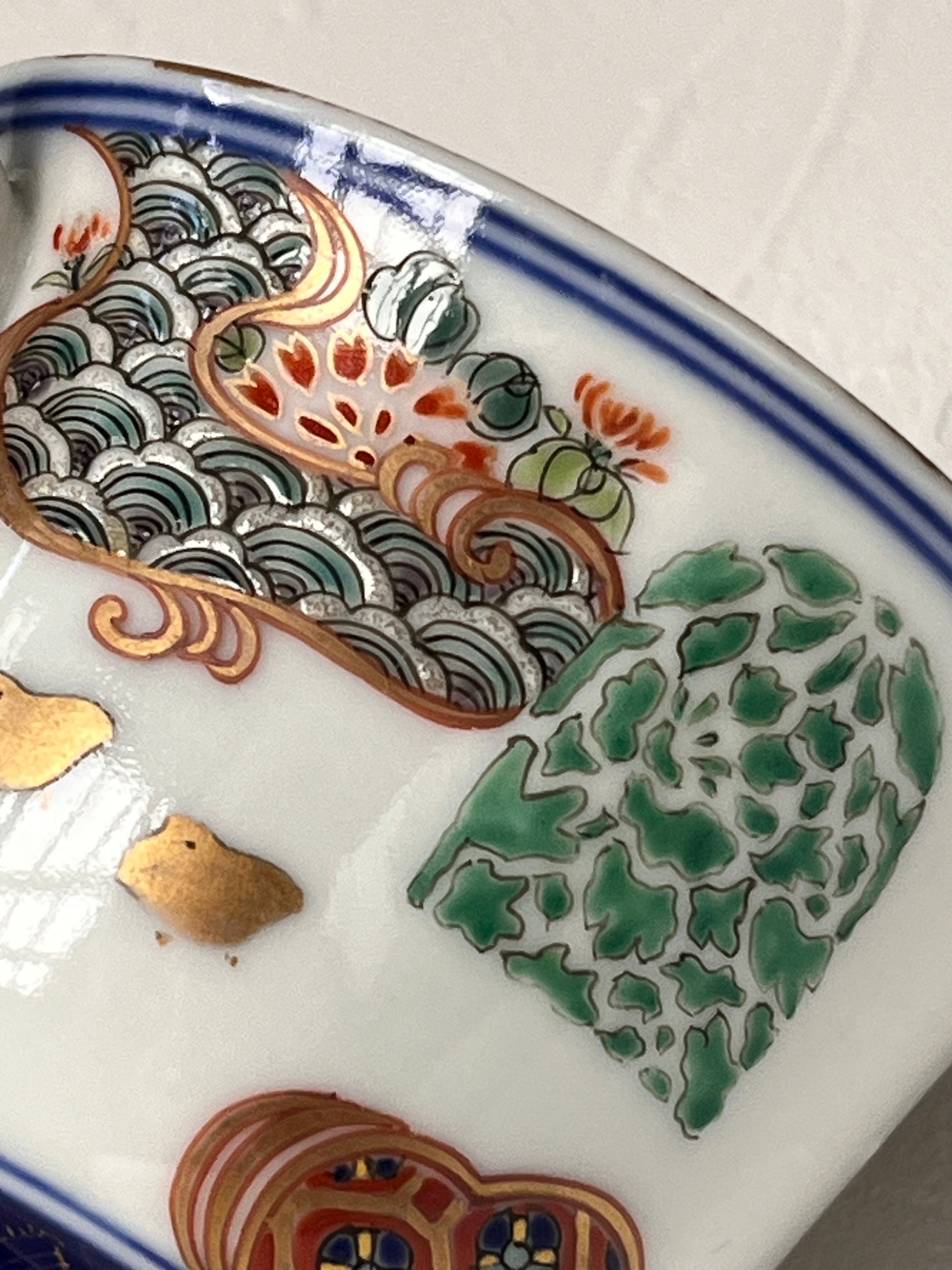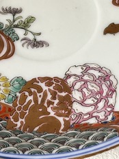 流れる様な流水に花兎文や緑やピンクの草叢、青海波に菊花等が巧みに配されています。