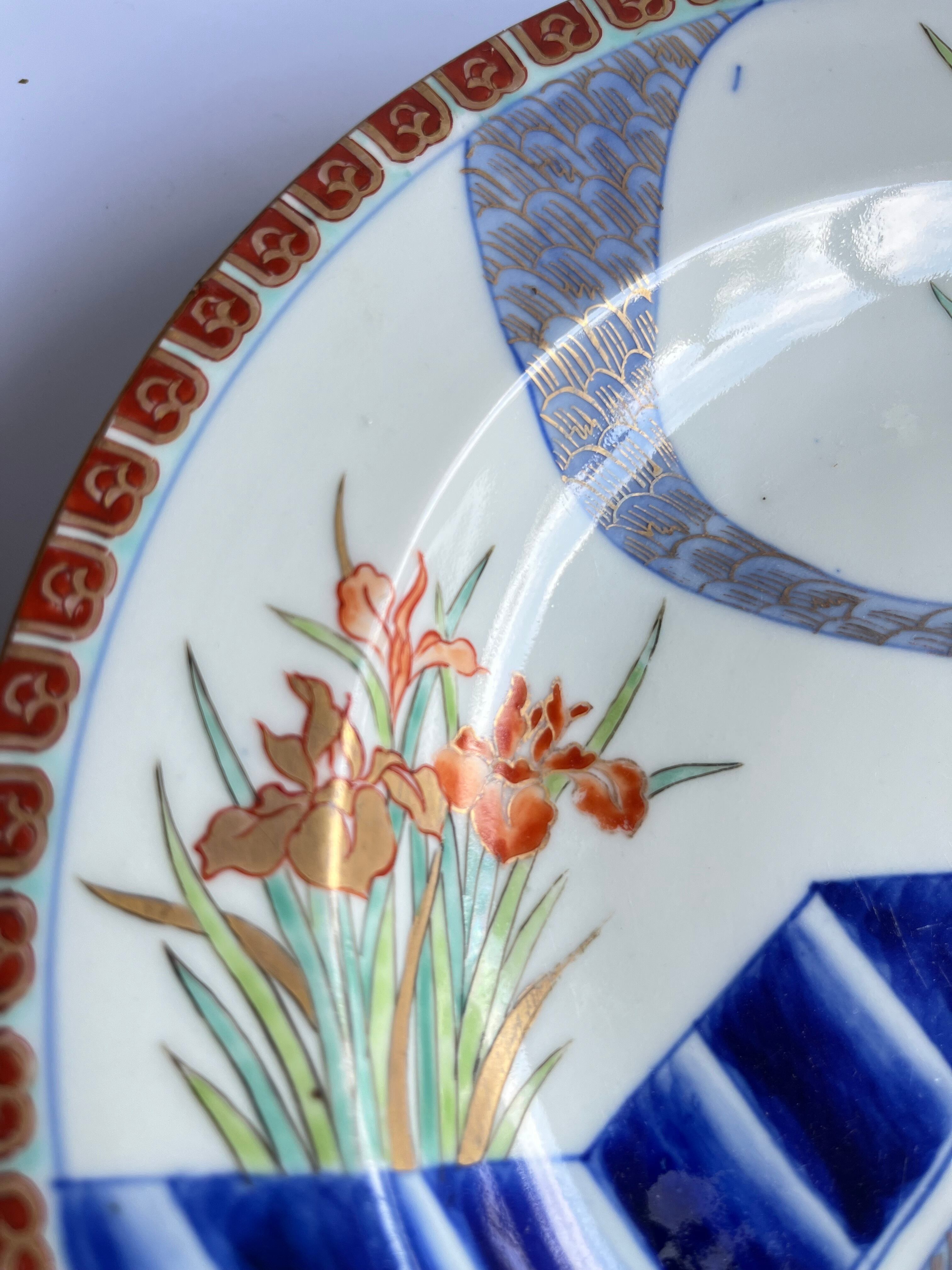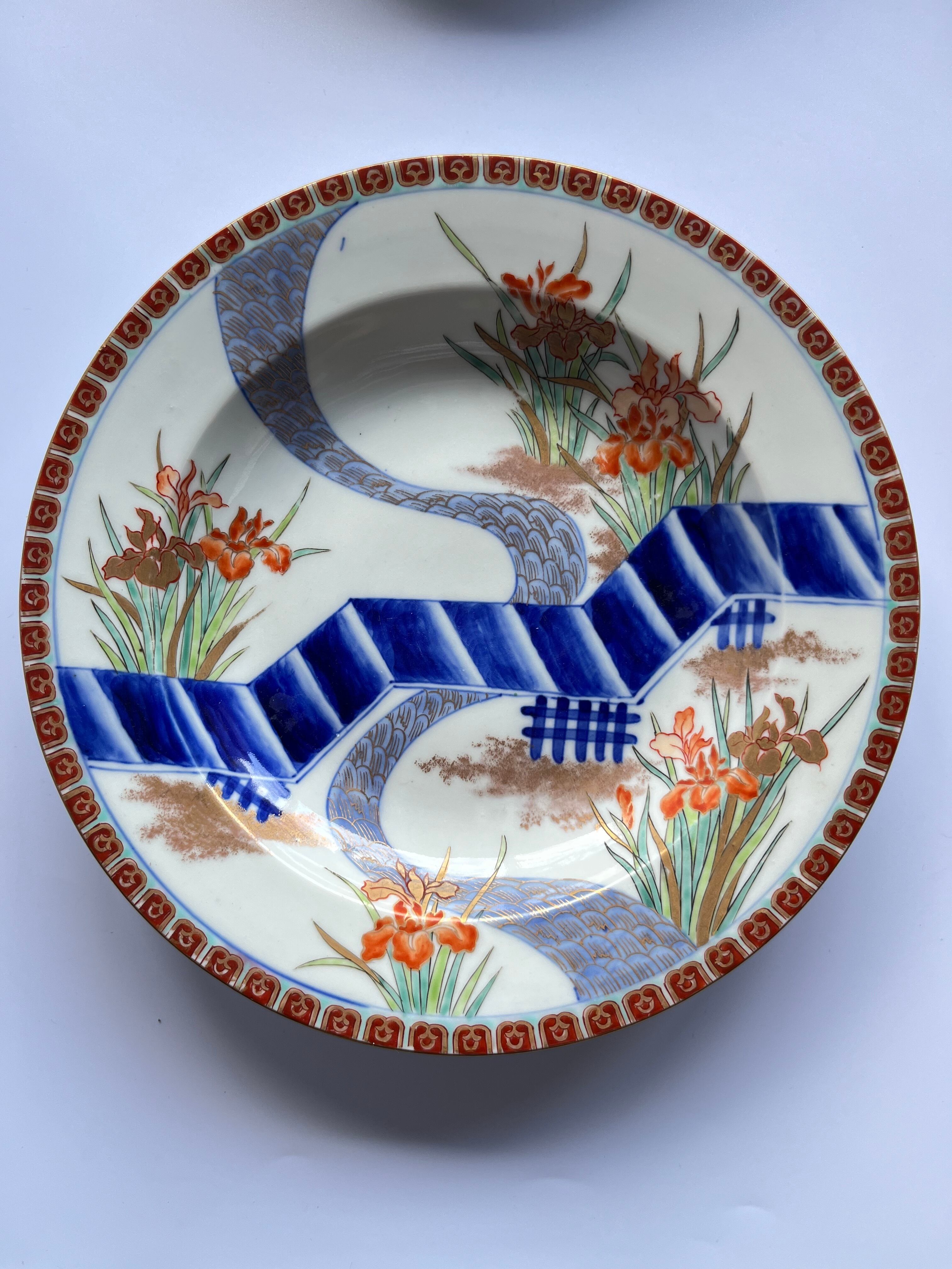 アンティーク 色絵杜若に八橋図洋皿 6枚組 精磁会社製 明治中期